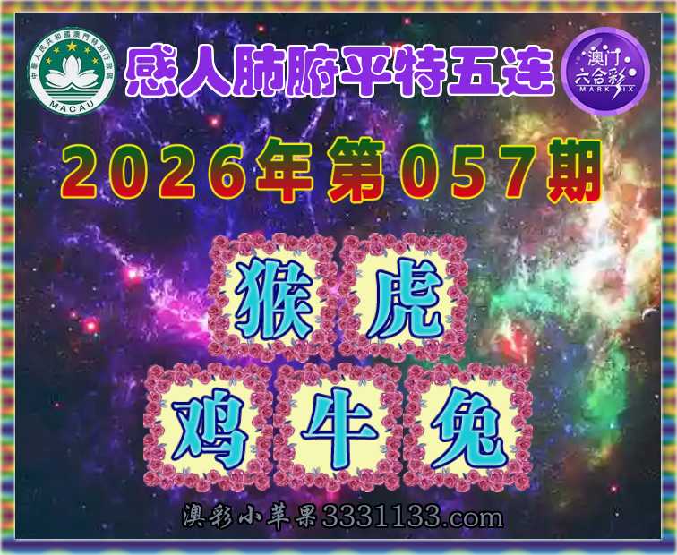 057期: 『感人肺腑』 平特五连【猴虎鸡牛兔】开:猴23,虎29,鸡34,牛30,兔40