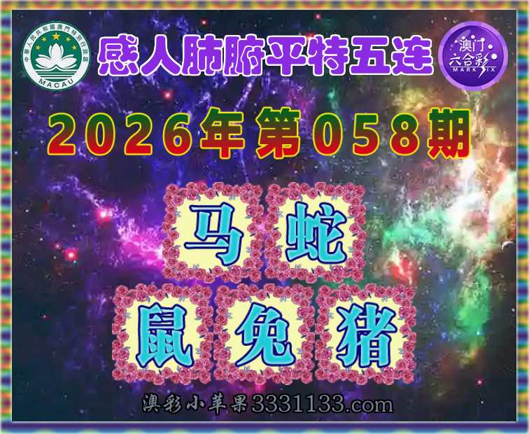 058期: 『感人肺腑』 平特五连【马蛇鼠兔猪】开:马13,蛇38,鼠31,兔40,猪20