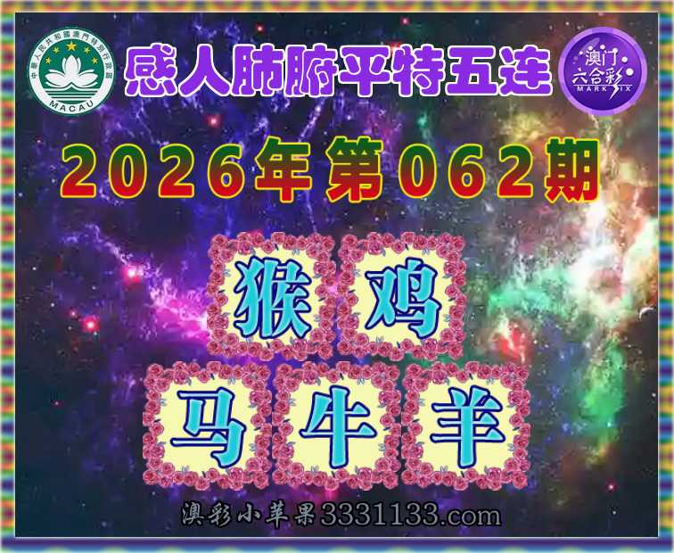 062期: 『感人肺腑』 平特五连【猴鸡马牛羊】开:猴35,鸡46,马49,牛06,羊24准上榜高手